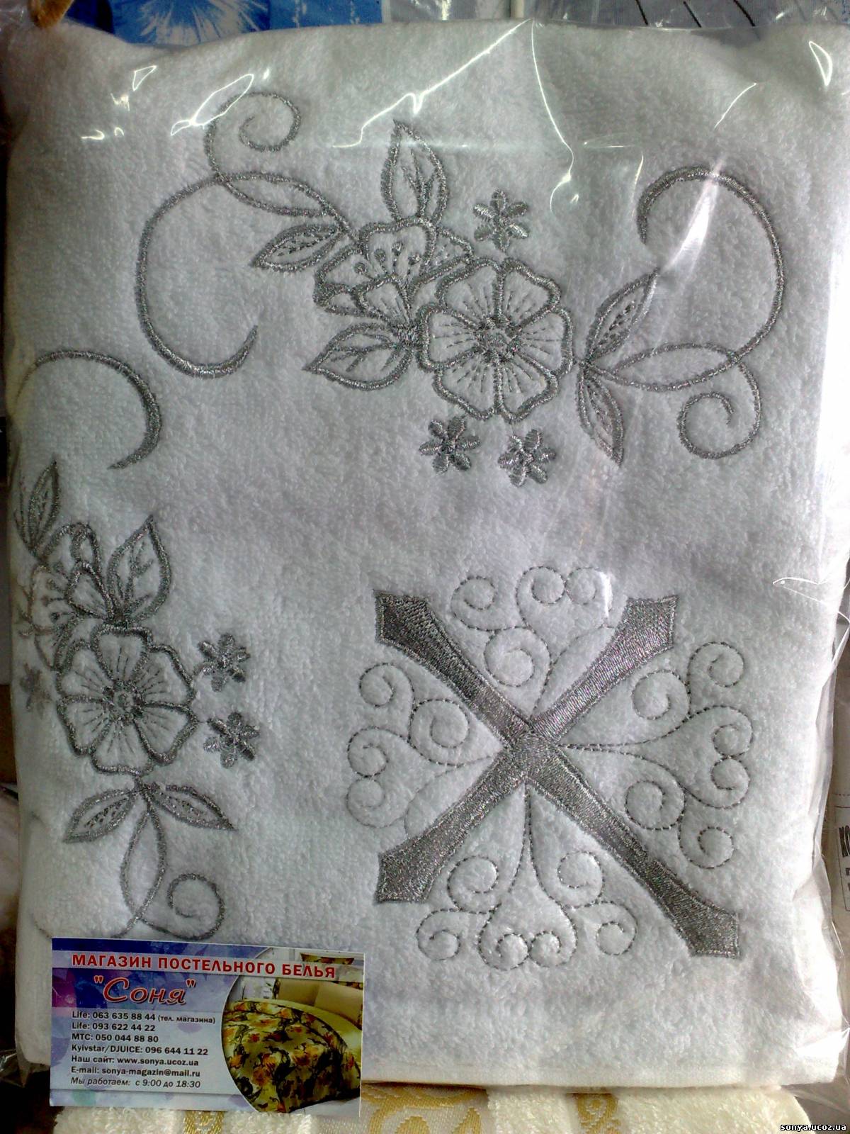 вишивка на борді золотим,або срібним люрексом,100%бавовна,на самому рушнику є тиснення у вигляді ангелів,якість відмінна